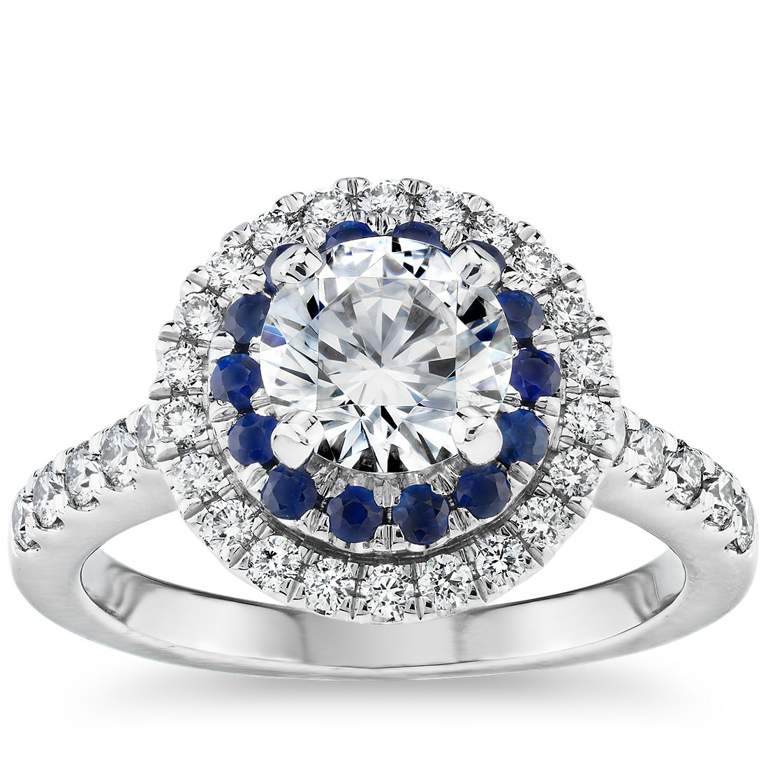 Al igual que poner un diamante en un pedestal de gemas, este diseño espectacular eleva su diamante y lo rodea con un halo de zafiros y luego con otro halo de diamantes, acompañado por más diamantes que rodean el anillo de oro blanco.